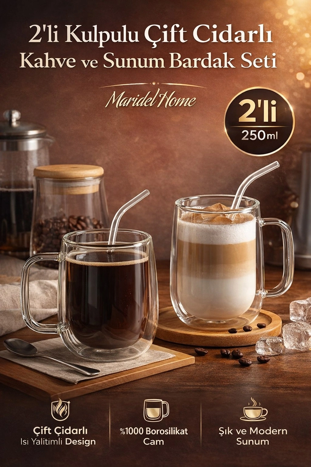 Çift Cidarlı Bardak 250 ml Ev Ofis Çay Fincanı Kahve Sunum Bardağı Dayanıklı Kupa Cam Bardak 2'li