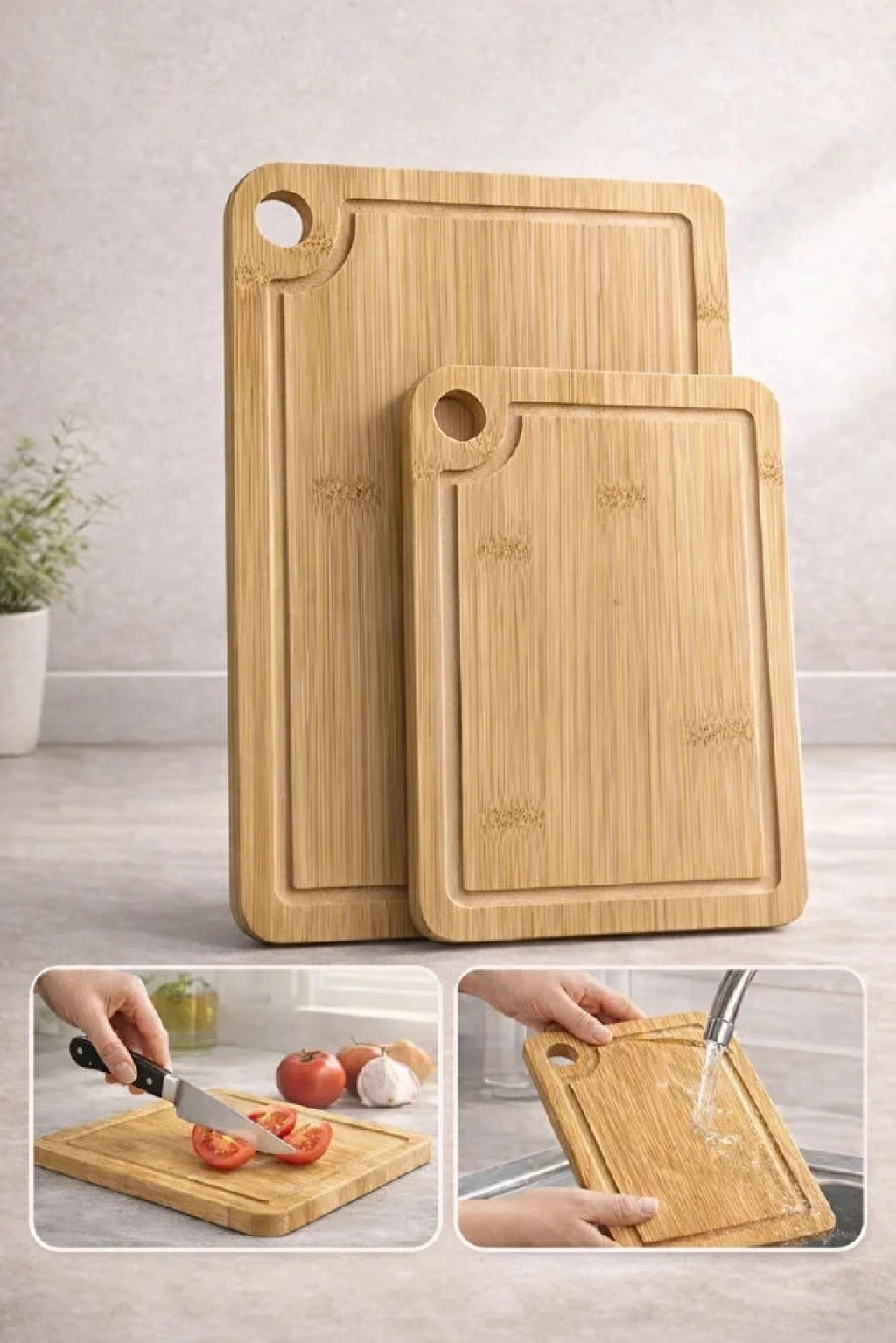 2'li Bambu Kesim Tahtası Tutmalı Peynir Sunum Tepsi Sebze Doğrama Panosu Seti | Büyük + Orta Boy