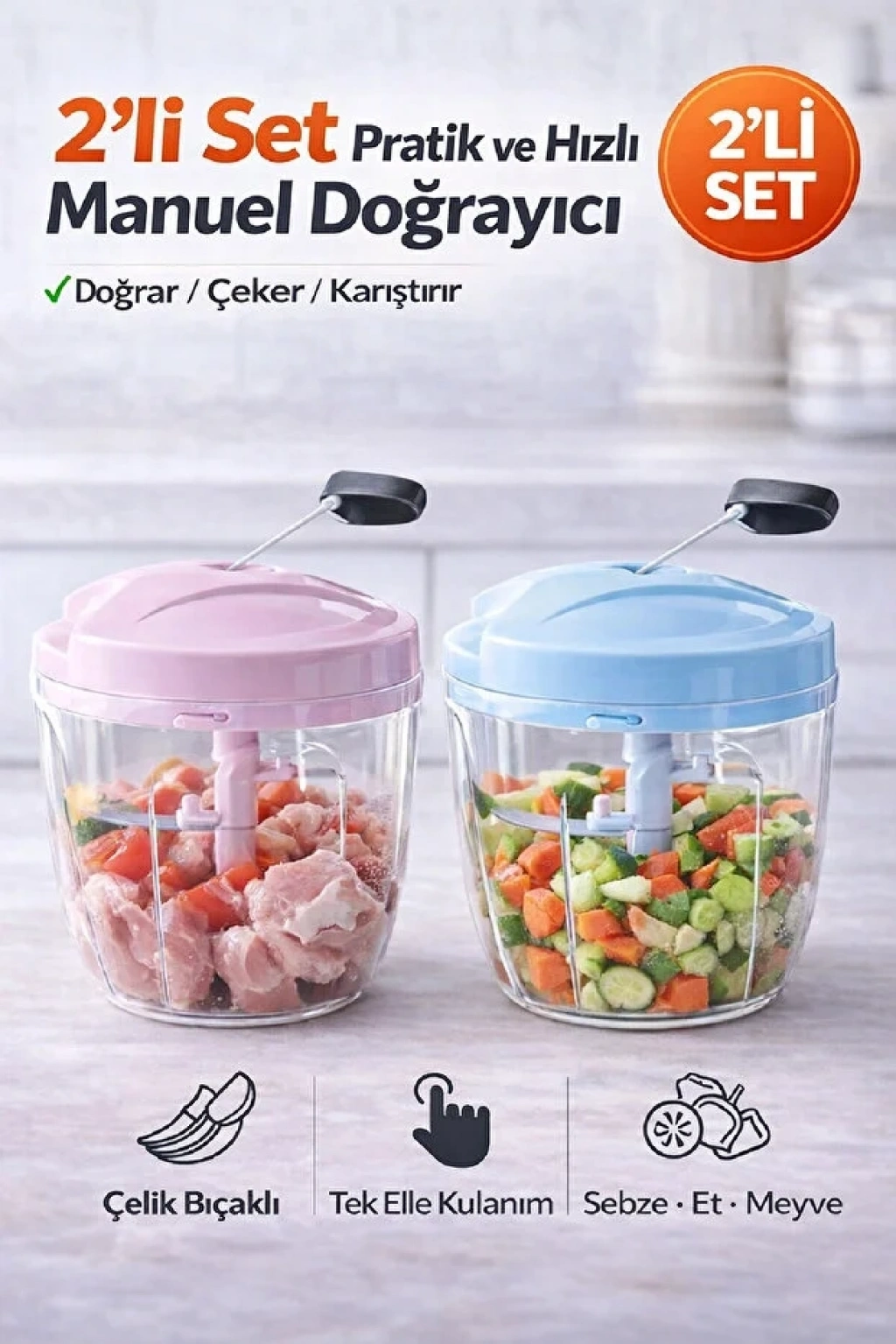 2'li İpli El Rondosu 5 Bıçaklı Büyük Boy Sebze Meyve Et Soğan Keskin Çelik Bıçaklı Extra Dayanıklı