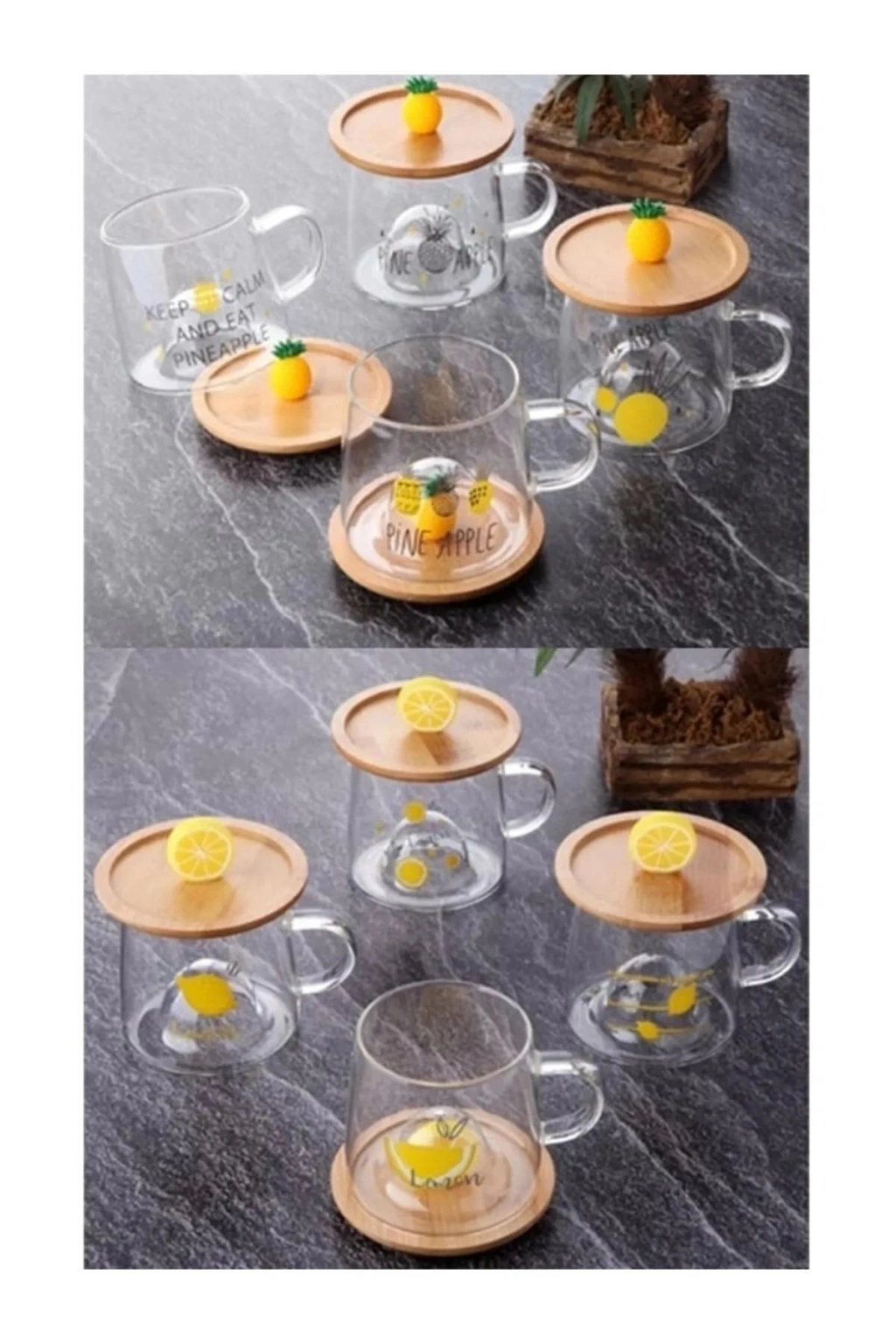 3d Limon Figürlü Baskılı Sıcak Soğuk Borosilikat Cam Meşrubat Kupası Su Çay Bardağı Bambu Kapaklı