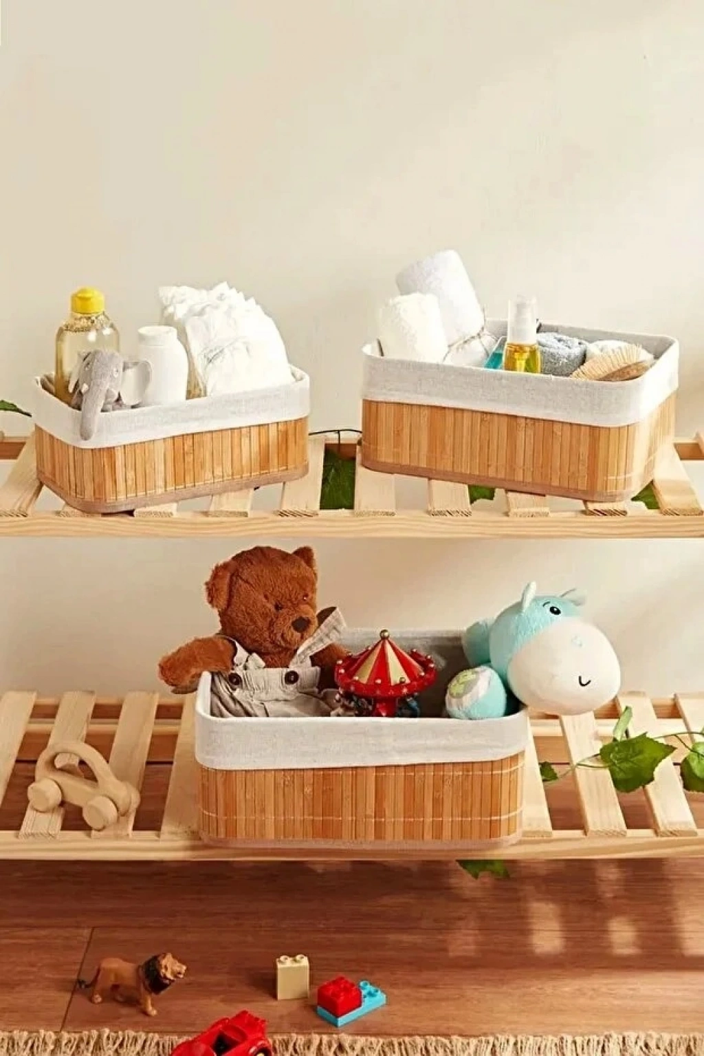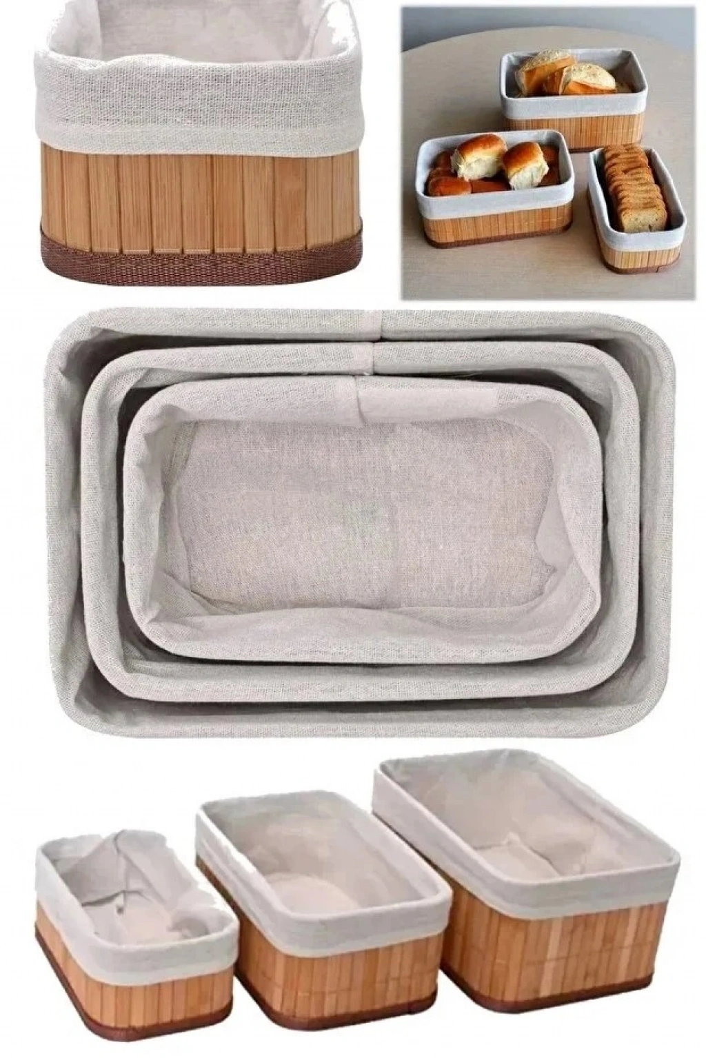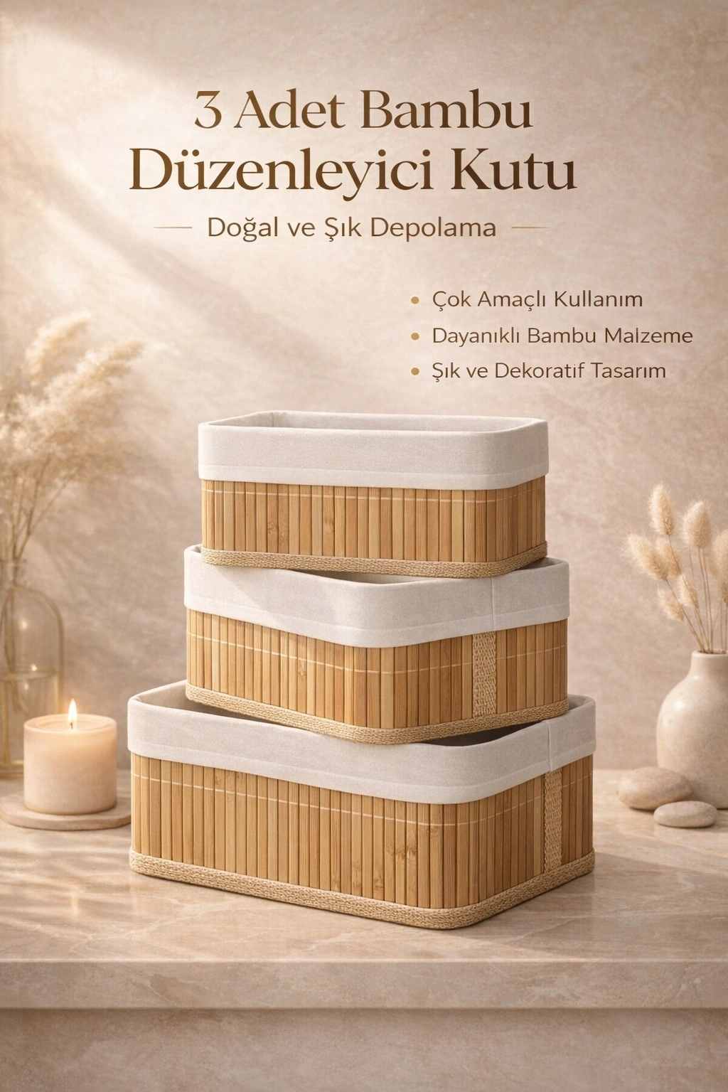 3’lü Bambu Düzenleyici Hasır Sepet | Dekoratif Ev Banyo Saklama ve Organizer Kutusu