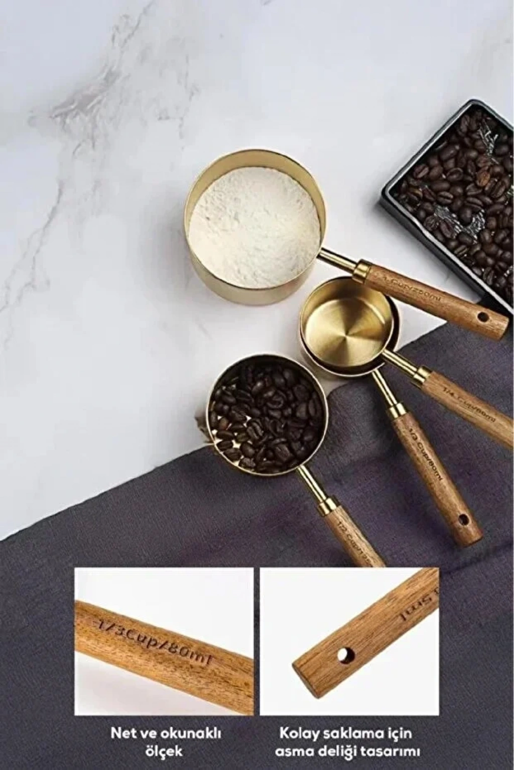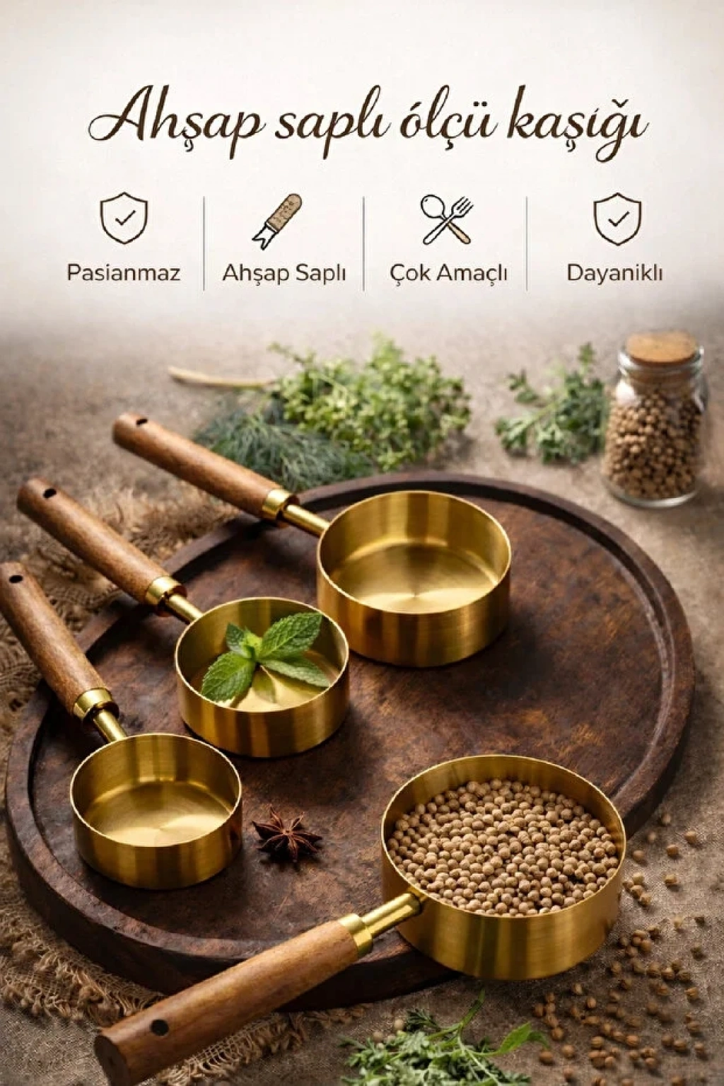 4lü Ahşap Saplı Metal Ölçü Kaşığı Seti Paslanmaz Gold Kaşığı Seti Ölçü Kabı