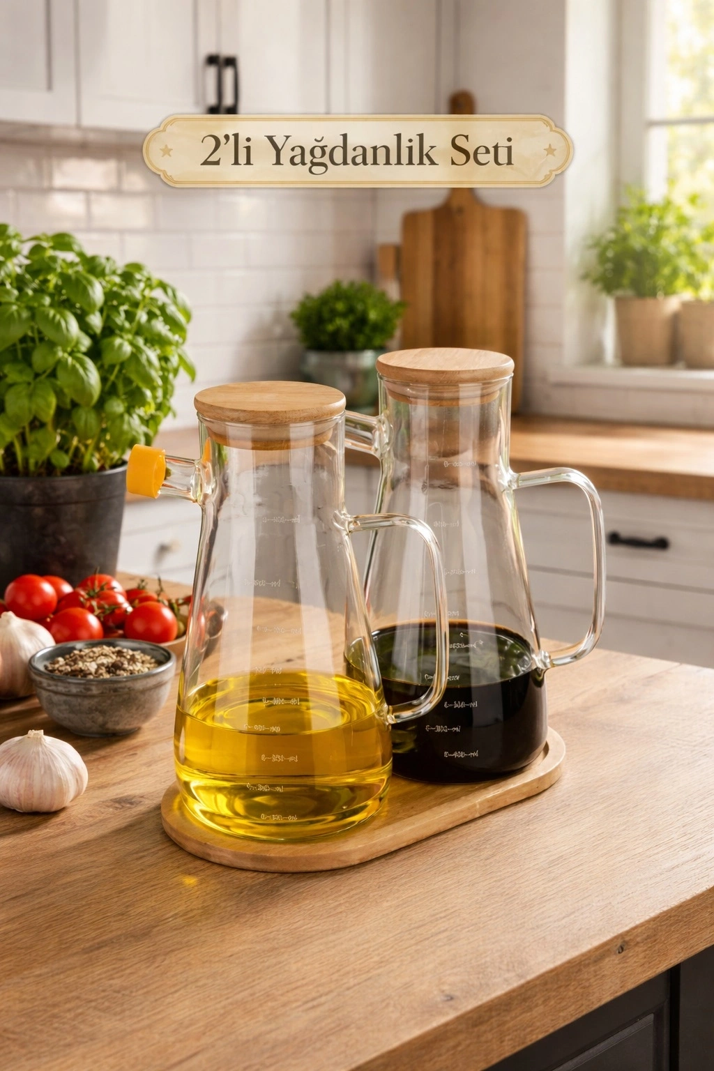 Ahşap Standlı 2’li Cam Yağdanlık Sirkelik Seti | Bambu Kapaklı Ölçekli Ahşap Standlı Set