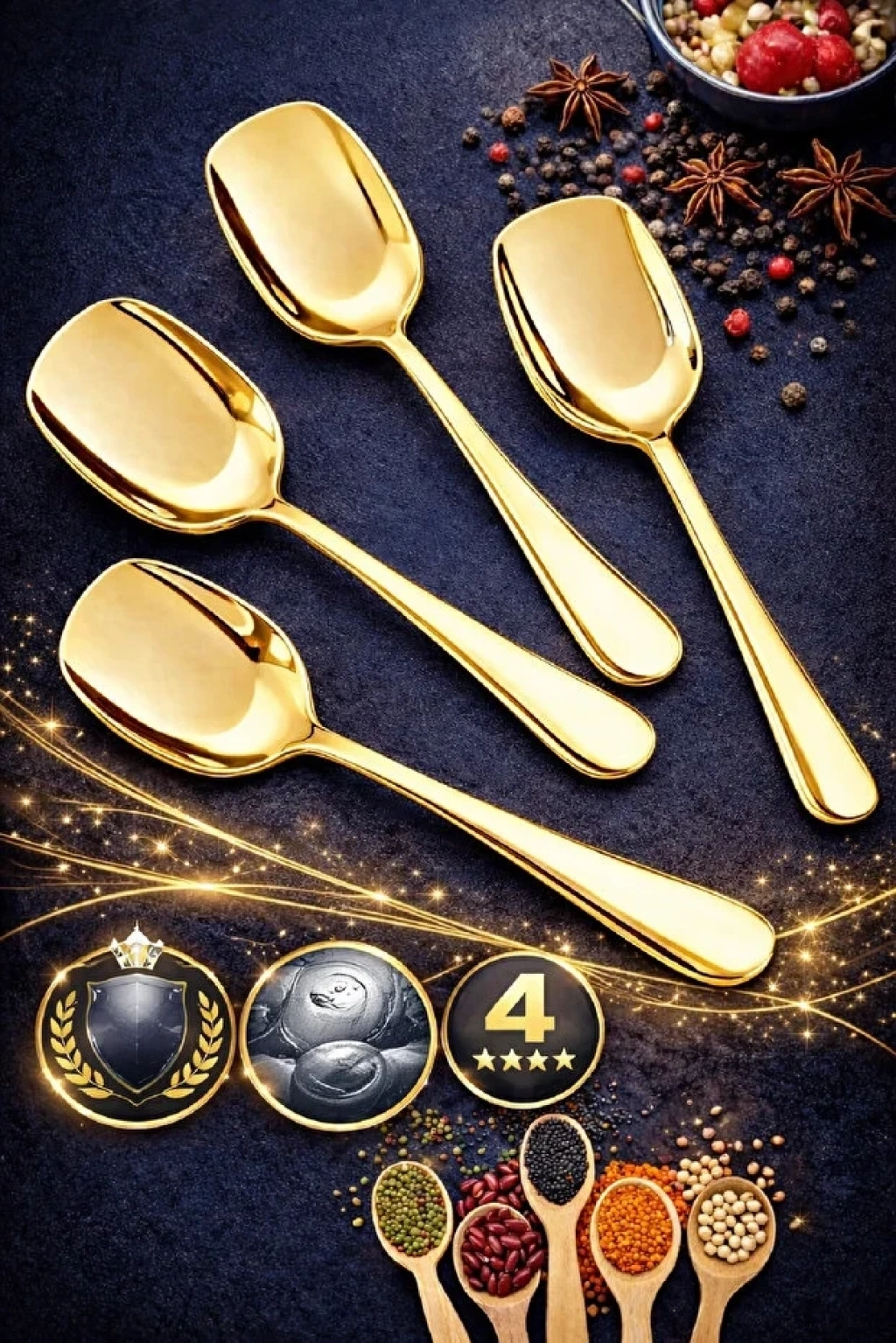 Gold Servis Kaşığı Seti Küçük Boy Paslanmaz Çelik Kaşık Salata Yemek Mutfak Kaşığı | 4 Adet
