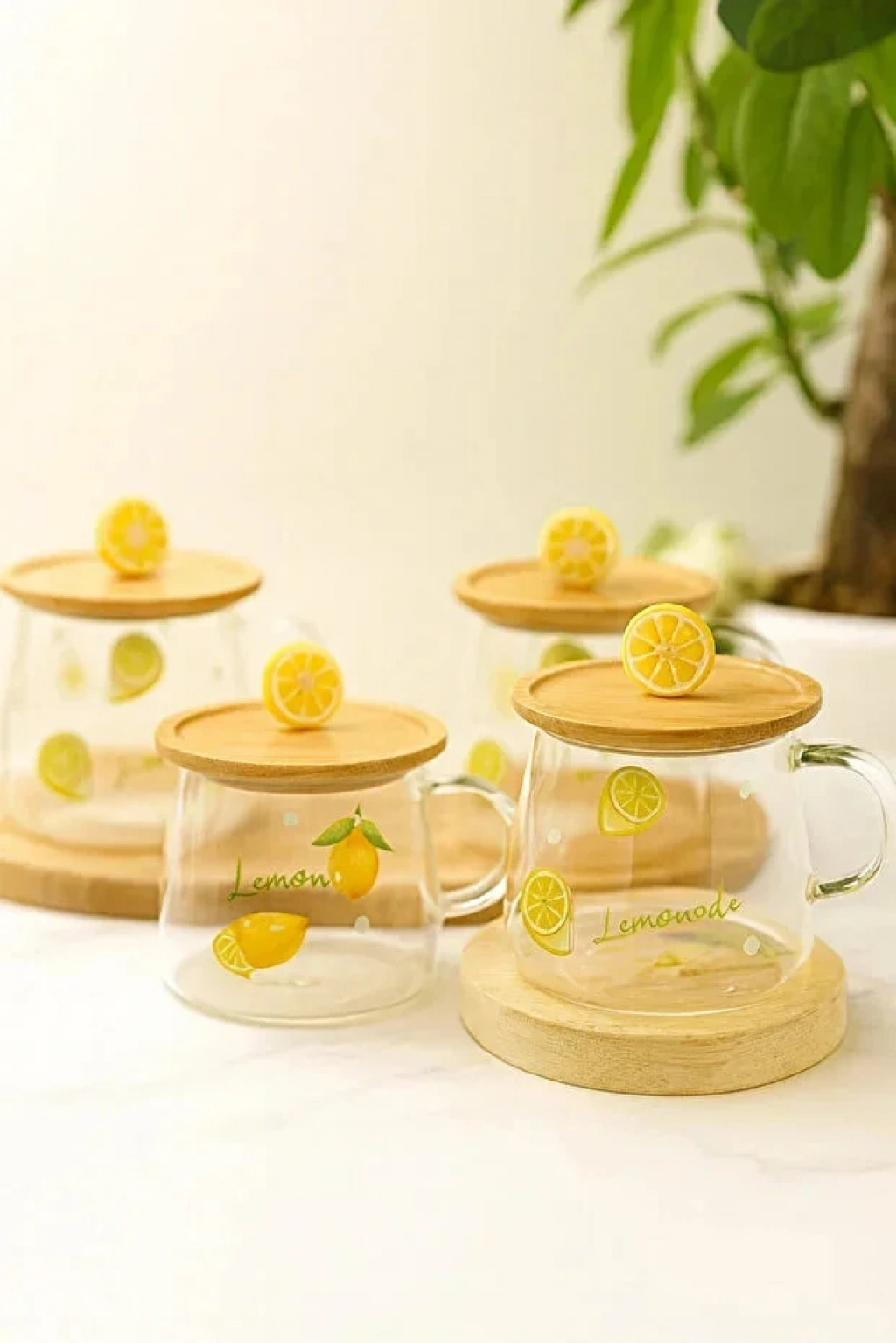 Limon Figürlü Baskılı Sıcak Soğuk Borosilikat Cam Meşrubat Kupası Su Çay Bardağı Bambu | 4 Adet