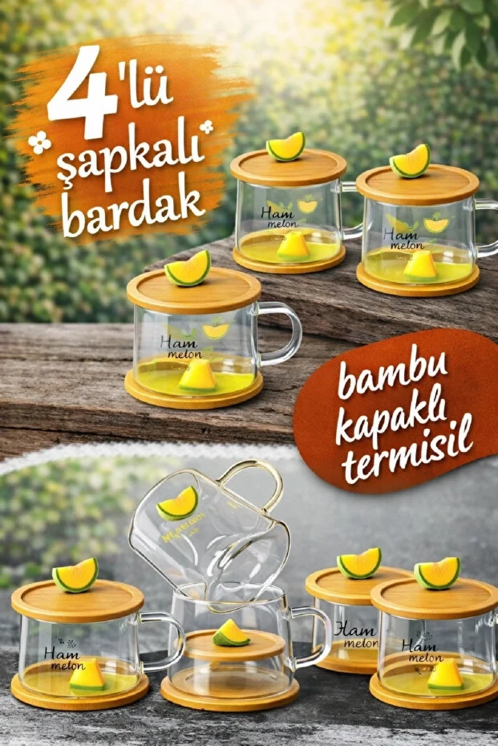Kavun Figürlü Baskılı Sıcak Soğuk Borosilikat Cam Meşrubat Kupası Su Çay Bardağı Bambu | 4 Adet