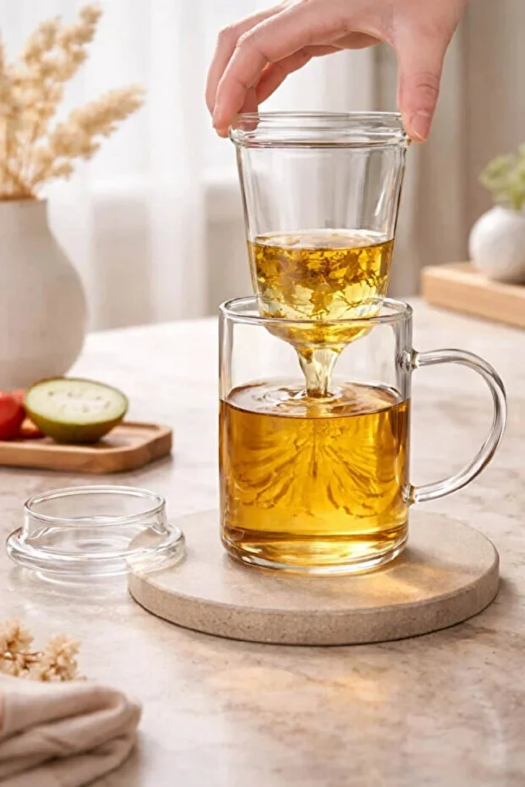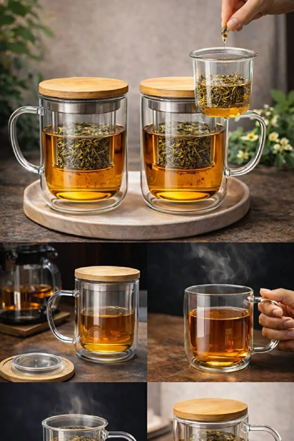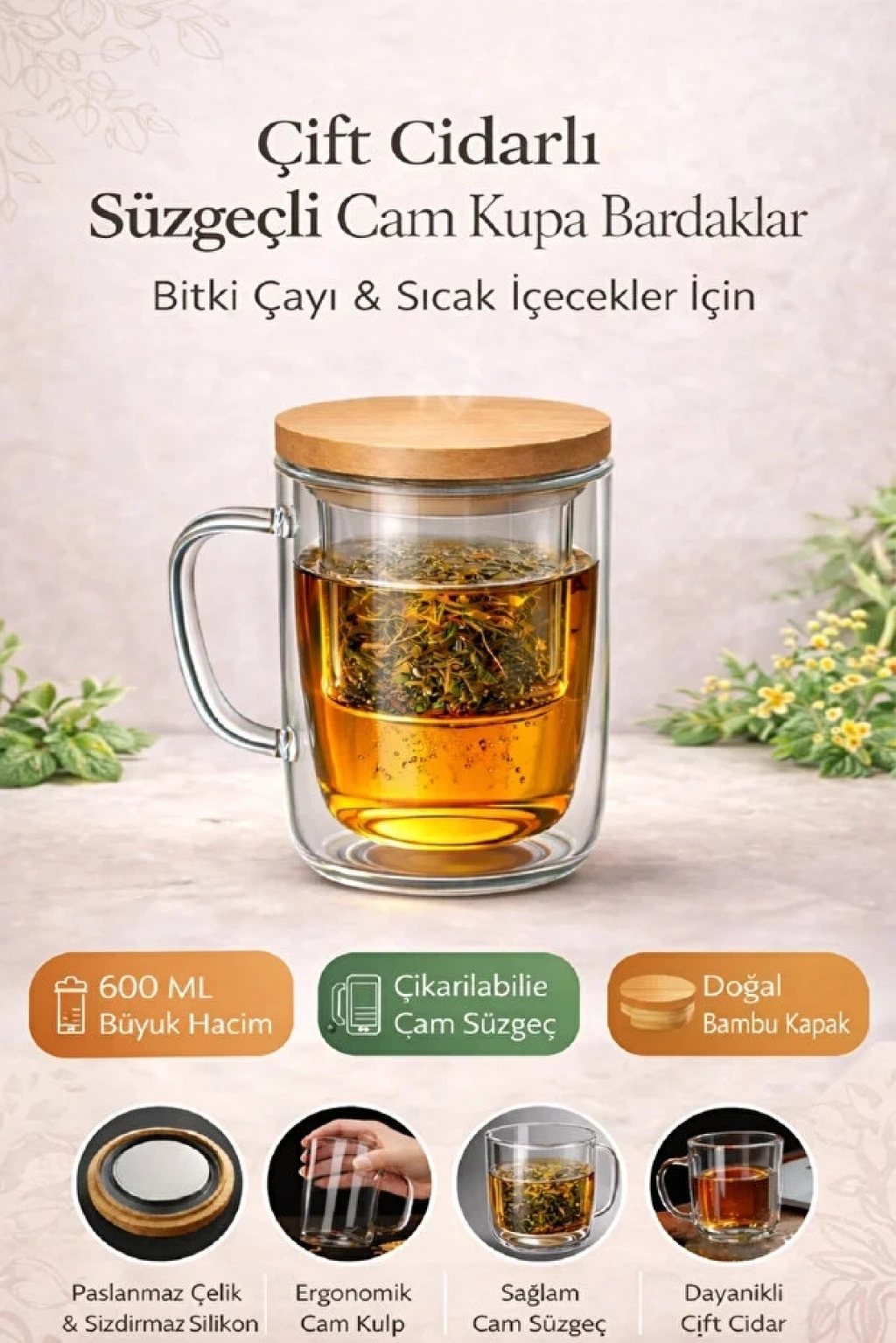 Süzgeçli Cam Kupa Bardak Çift Cidarlı Isı Yalıtımlı Bambu Kapaklı Bitki Çayı Fincanı Seti - 1 Adet